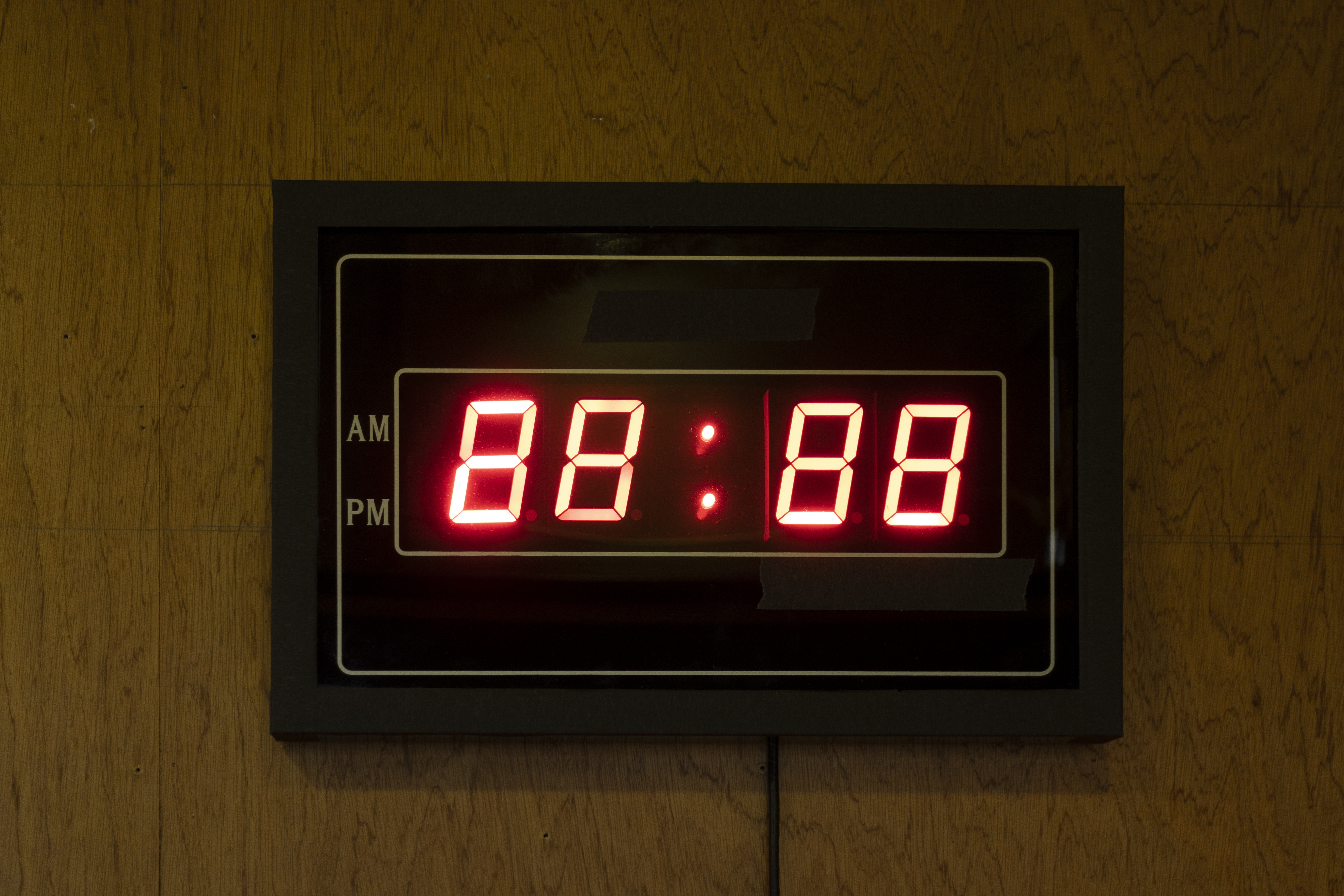 비디오 설치, 가변크기, 단채널 비디오, 컬러, 사운드; 텔레비전 4대, AV분배기, 디지털 벽 시계, 아두이노, 2019